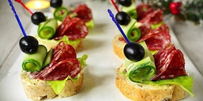 6. На шпажку одягніть половину оливки. Далі потрібно нанизати на шпажку шматочок огірка у вигляді хвилі. Після огірка наколіть на шпажку для канапе ковбасу.