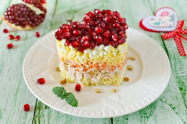 7. Тепер викладаємо салат шарами у вигляді серця (або використовуючи форму у вигляді серця), посипаючи на свій смак сіллю і чорним перцем: перший шар – куряче філе; другий шар – обсмажена цибуля, змащуємо або поливаємо майонезом; третій шар – яйця, трохи солимо; четвертий шар – сир; п’ятий шар – горіхи, поливаємо майонезом, шостий шар – буряк, майонез; сьомий шар – зерна граната.