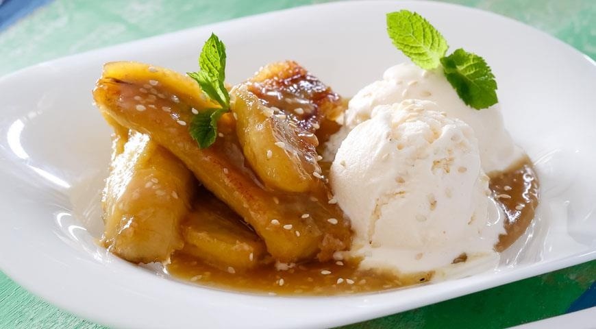 5. Подавайте банани з морозивом і за бажанням прикрасьте листочком м'яти.