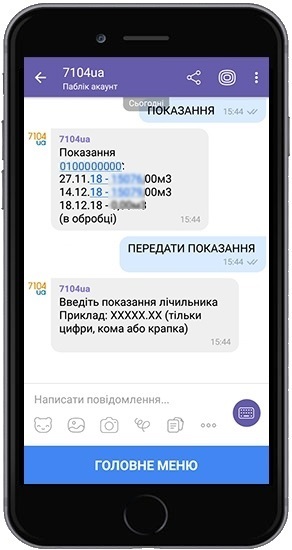 На сайті служби газу зазначено, що передати показники та сплатити за послугу можна за допомогою чат-бота 7104ua у Viber за наявності особового рахунку в "Житомиргаз Збут".