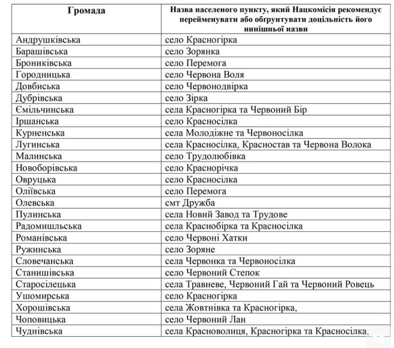 Раніше ми писали, що на Звягельщині можуть перейменувати кілька населених пунктів за рекомендацією Нацкомісії. В списку є села, зокрема у Баранівській, Барашівській, Брониківській, Городницькій, Ємільчинській, Дубрівській та Піщівській громадах. Деталі тут.