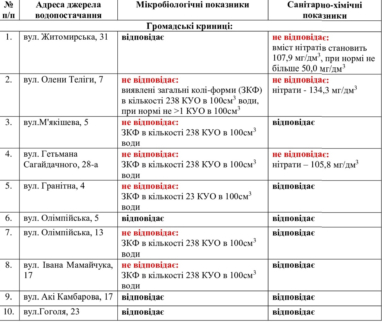 Управління житлово-комунального господарства та екології міськради повідомило, що Звягельський районний відділ ДУ "Житомирський обласний центр контролю та профілактики хвороб МОЗ України" 3 грудня провів лабораторні дослідження проб питної води із громадських криниць міста.
