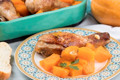 - Очистьте гарбуз і наріжте кубиками зі стороною близько 2 см. Цибулю подрібніть кубиками, а шампіньйони розріжте на 4 частини. Куряче філе наріжте невеликими шматками.