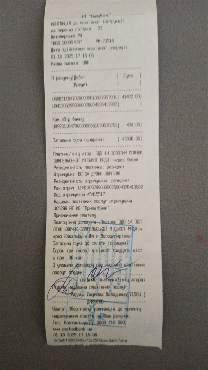 Отримувач: БО БФ ДРОНИ ЗВЯГЕЛЯ