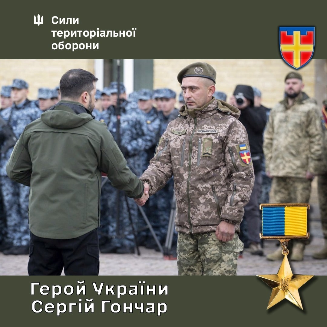 "Президент України Володимир Зеленський вручив найвищу Державну нагороду – Золоту Зірку Героя України нашому земляку, старшому солдатові 115-ї окремої бригади Сил територіальної оборони Сергію Гончару.