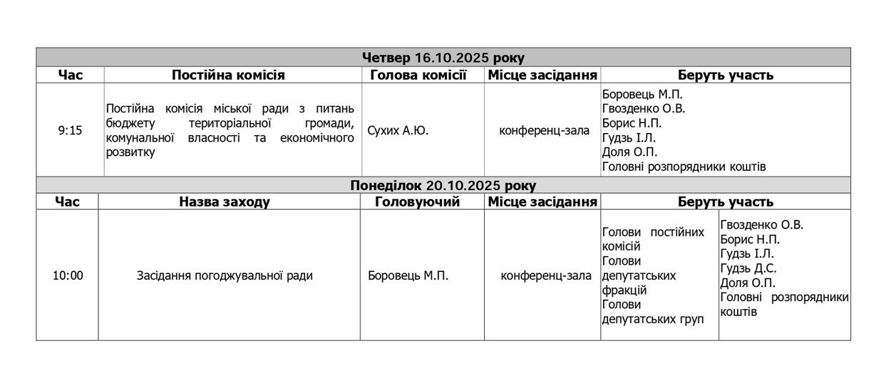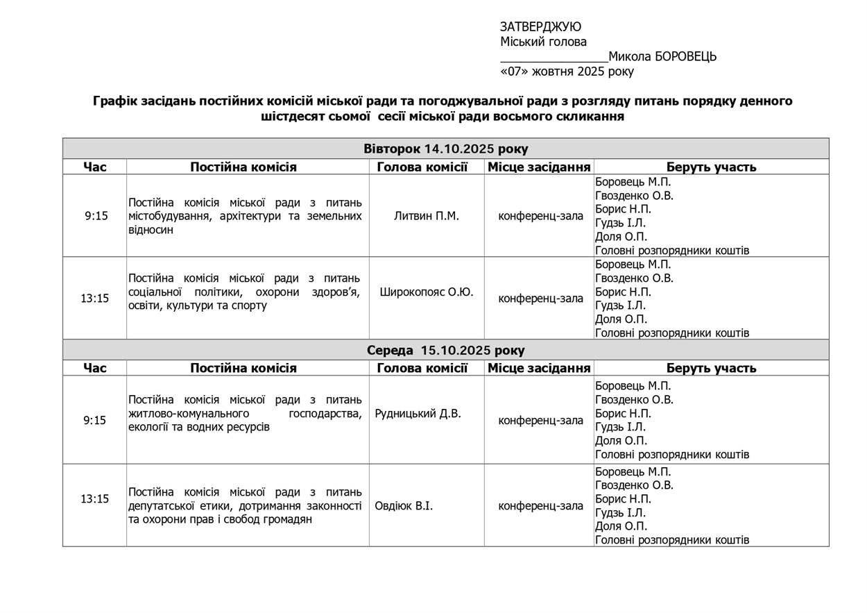 Засідання постійних комісій міської ради з розгляду питань порядку денного шістдесят сьомої сесії міської ради восьмого скликання будуть проведені з 14.10.2025 року по 16.10.2025 року у конференц-залі міської ради згідно графіку.