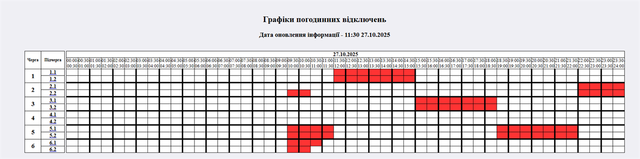 1 черга 1, 2 підчерги – з 11.30 - 15.00, 22.00 -24.00.