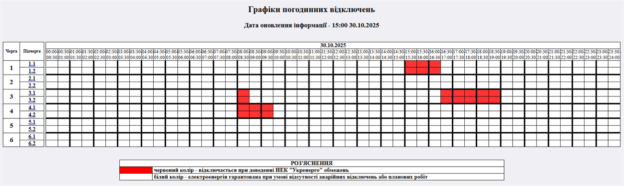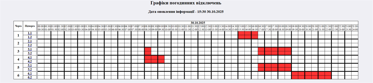 - 1.1, 1.2, 2.1, 2.2 – світла не буде з 15.00 - 16.30.
