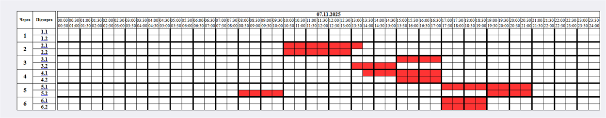 Увага! Графік може змінюватися протягом дня залежно від ситуації в енергосистемі. Слідкуйте за оновленнями від вашого постачальника електроенергії.