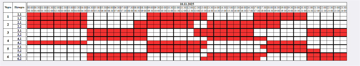 - Черга 2.1, 2.2: 00:00 - 04:30, 08:00 - 12:30, 13:30 - 19:00