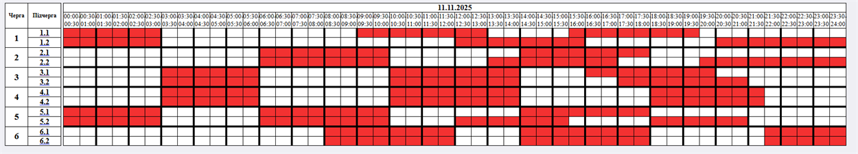 - Черга 1.1: 00:00 - 03:00, 09:00 - 13:00, 15:30 - 19:30