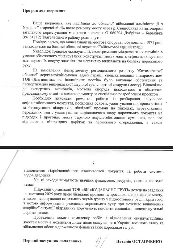 Документ підписала перший заступник начальника ОВА Наталія Остапченко та містить детальну інформацію про стан мосту.