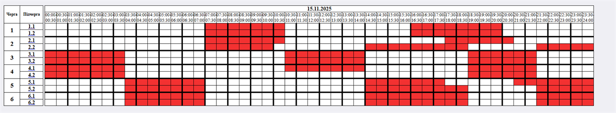 - Черга 3.1, 3.2: 00:00 - 03:30, 10:30 - 14:00, 18:30 - 21:30