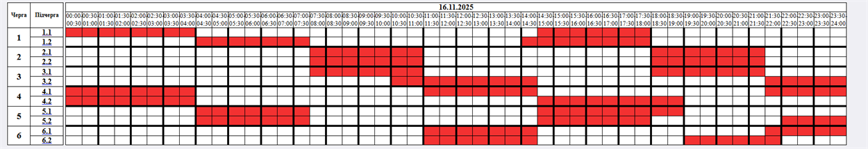 - Черга 6.1: 11:30 - 14:30, 21:30 - 24:00