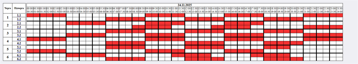 - Черга 1.1: 00:00 - 03:00, 09:00 - 12:00, 15:00 - 18:00, 21:00 - 24:00
