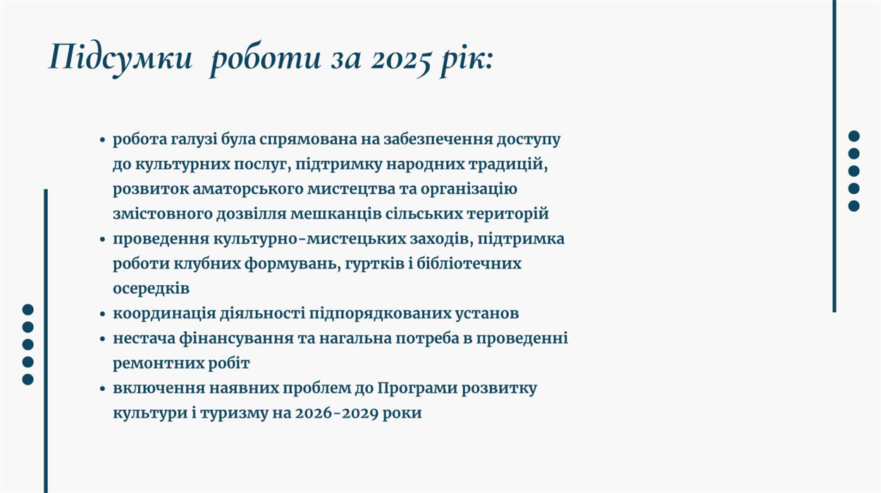 Окрему увагу під час засідання було приділено розвитку культурного середовища в сільських територіях громади. Начальник управління культури і туризму Олександр Широкопояс представив Інформацію про виконання заходів розвитку сільської місцевості громади в галузі культури (деталі тут).