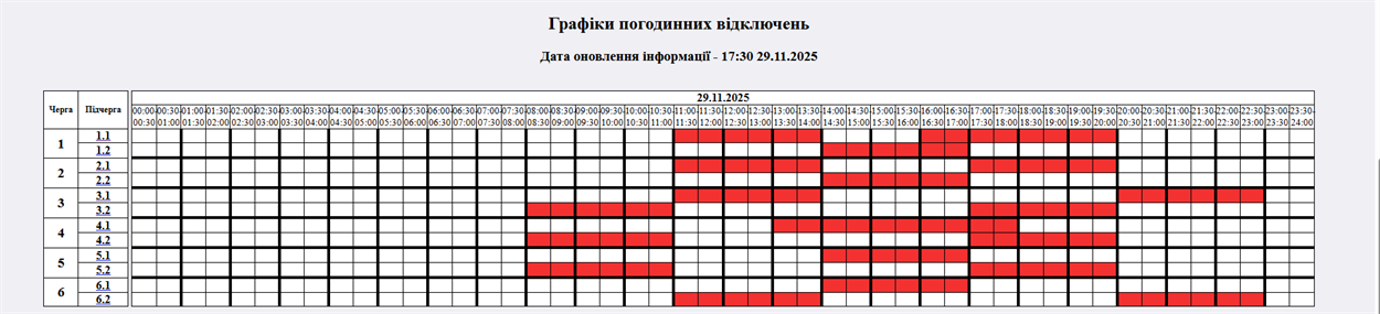 а розпорядженням НЕК "Укренерго", у суботу, 29 листопада, графіки погодинних відключень (ГПВ) застосовуватимуться протягом доби.