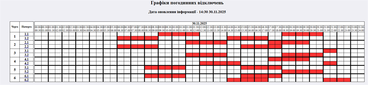 Житомиробленерго оприлюднило графік планових відключень електроенергії на неділю, 30 листопада 2025 року. Традиційно у вихідні дні споживання електроенергії промисловістю знижується, проте через загальний дефіцит в енергосистемі України графіки погодинних відключень продовжують діяти.