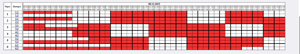 - Черга 1.1: 00:00 - 04:30, 08:00 - 15:00, 18:30 - 22:00