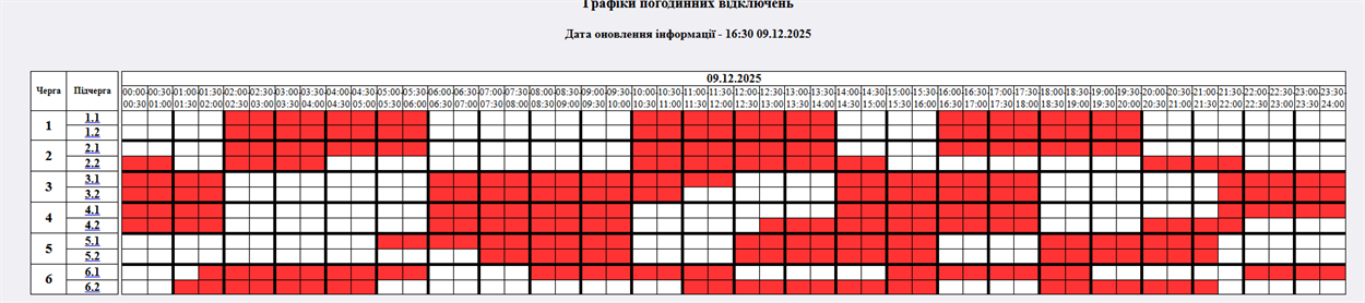 - Черга 6.1: 01:30 - 06:00, 08:00 - 12:00, 15:00 - 19:00, 22:00 - 24:00