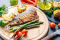 - Викладіть рибу на деко, розкладіть навколо овочі та злегка полийте оливковою олією.