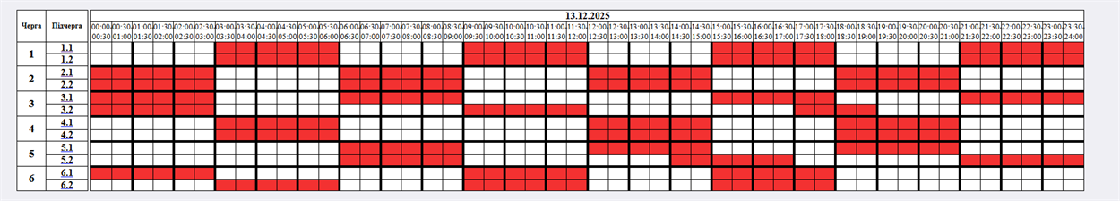 - Черга 1.1: 03:00 - 06:00, 09:00 - 12:00, 15:00 - 18:00, 21:00 - 24:00