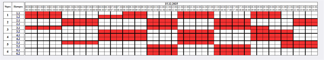 - Черга 1.2: 00:00 - 03:00, 06:00 - 10:00, 12:30 - 15:30, 18:30 - 21:00
