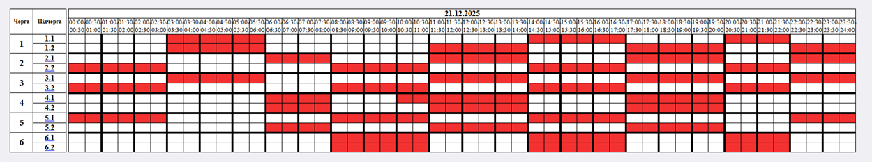 - Черга 1.2: 03:00 - 06:00, 11:00 - 14:00, 17:00 - 20:00, 22:00 - 24:00