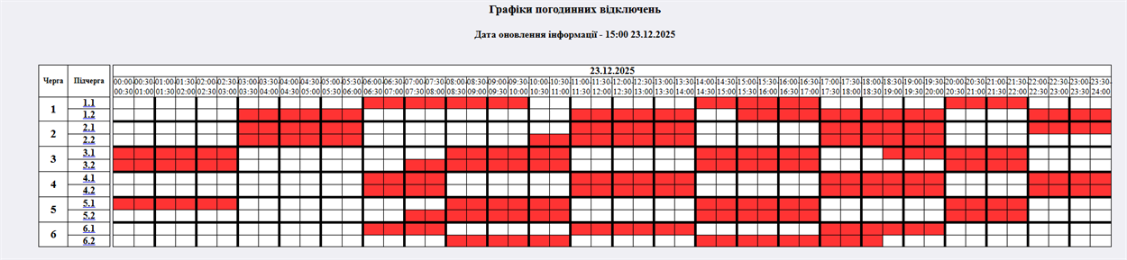- Черга 1.2: 03:00 - 06:00, 11:00 - 14:00, 17:00 - 20:00, 22:00 - 24:00