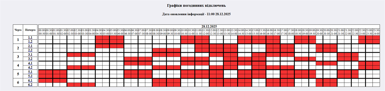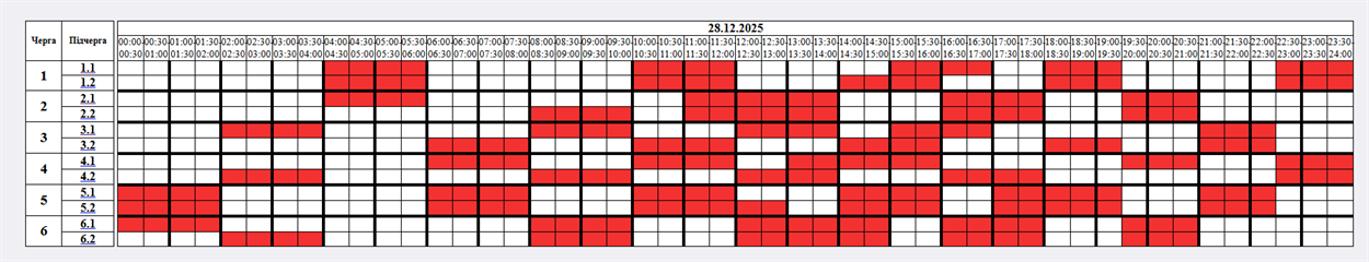 - Черга 1.1: 04:00 - 06:00, 10:00 - 12:00, 15:00 - 17:00, 18:00 - 19:30, 22:30 - 24:00