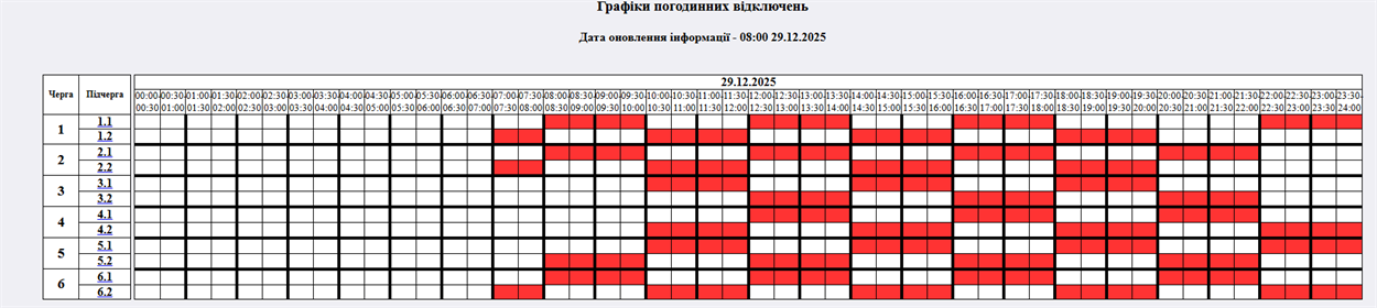 - Черга 1.2: 06:00 - 08:00, 10:00 - 12:00, 14:00 - 16:00, 18:00 - 20:00