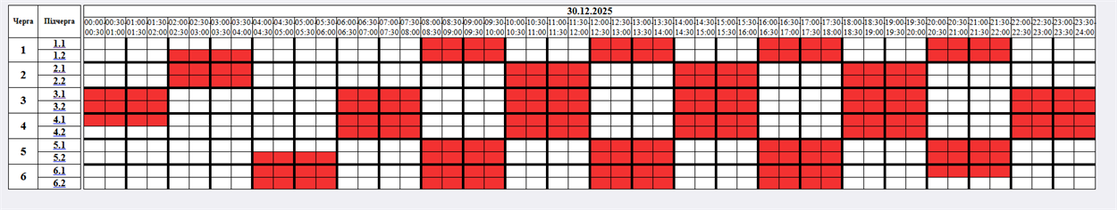 - Черга 1.2: 02:00 - 04:00, 08:00 - 10:00, 12:00 - 14:00, 16:00 - 18:00, 20:00 - 22:00