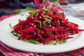 - Окремо змішайте оливкову олію, лимонний сік, сіль і перець. Заправте салат безпосередньо перед подачею та обережно перемішайте.