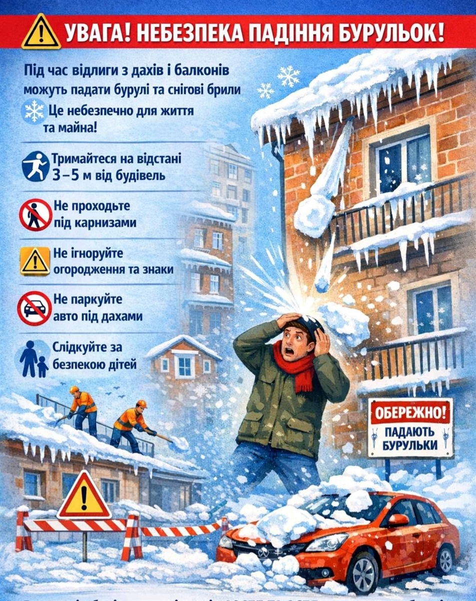 Через відлигу зростає небезпека падіння бурульок та снігових брил з дахів будинків і балконів. Такі випадки можуть становити серйозну загрозу для життя і здоров’я людей, а також спричинити пошкодження автомобілів та іншого майна.