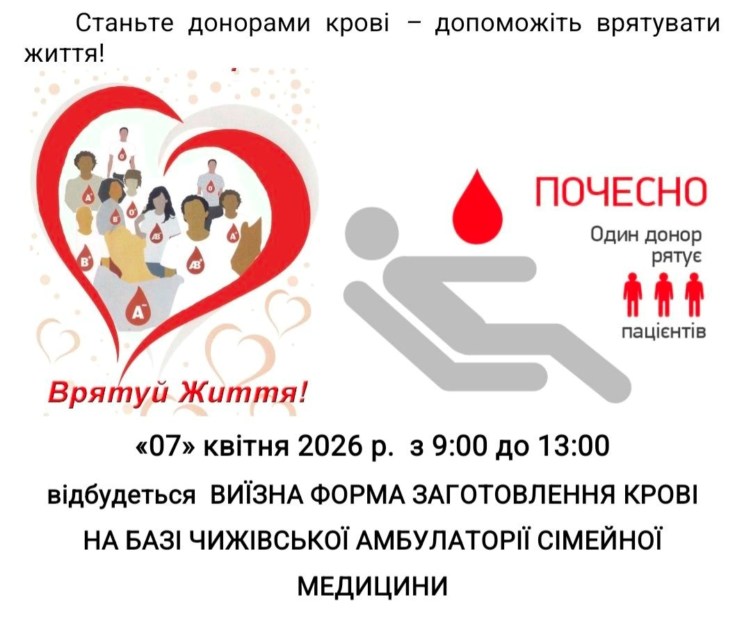 7 квітня Чижівська амбулаторія сімейної медицини прийматиме донорів крові. Акція триватиме з 9:00 до 13:00 і кожен, хто прийде, зможе не лише допомогти іншим, а й безкоштовно перевірити власне здоров'я.