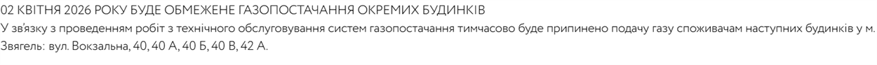 "У зв’язку з проведенням робіт з технічного обслуговування систем газопостачання тимчасово буде припинено подачу газу споживачам наступних будинків у м. Звягель: вул. Вокзальна, 40, 40 А, 40 Б, 40 В, 42 А", – повідомили у житомирській філії ТОВ "Газорозподільні мережі України".