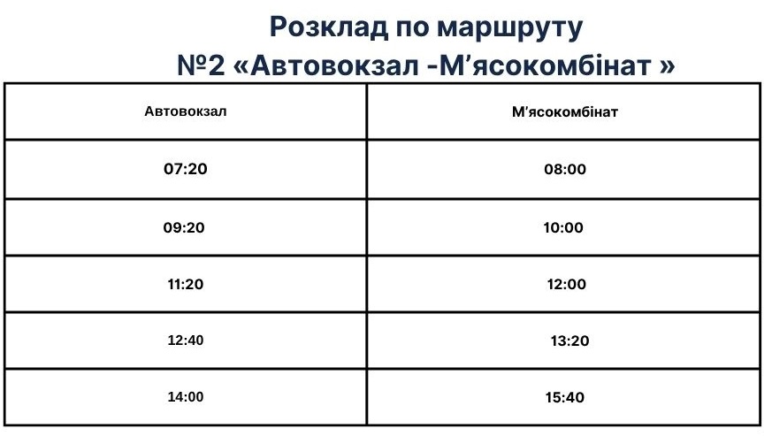 За маршрутом №2 "М’ясокомбінат – Автовокзал" організовано додаткові рейси за графіком нижче.