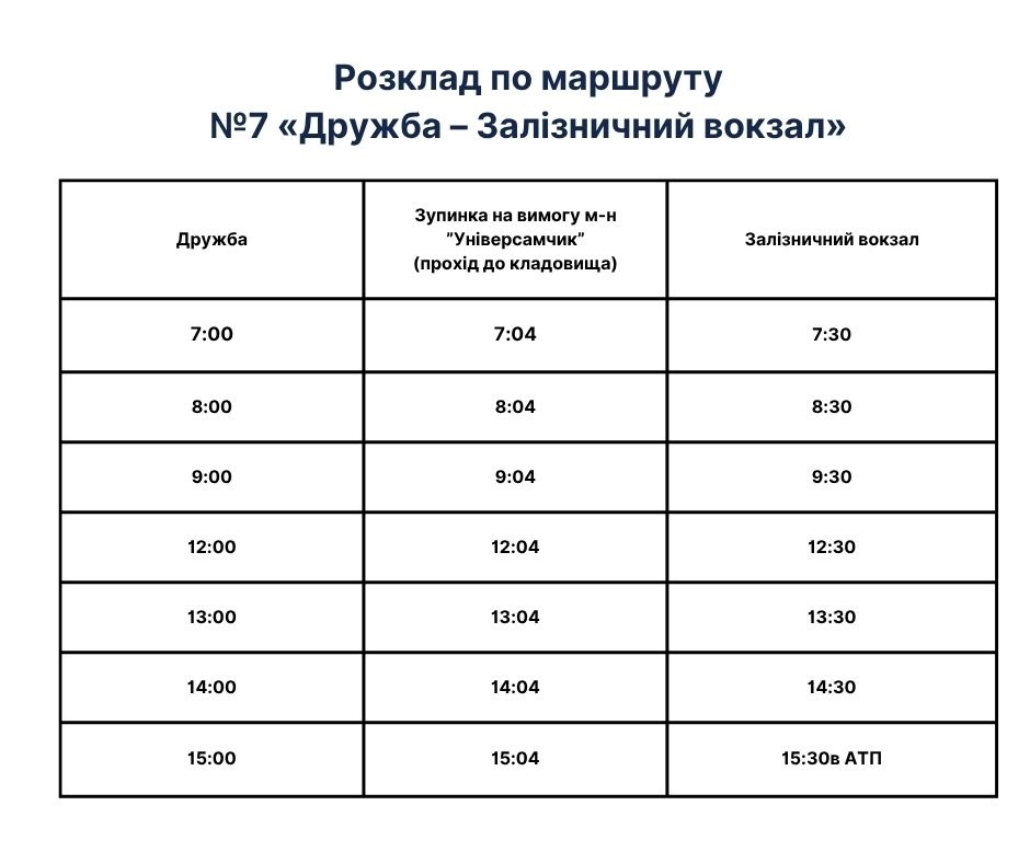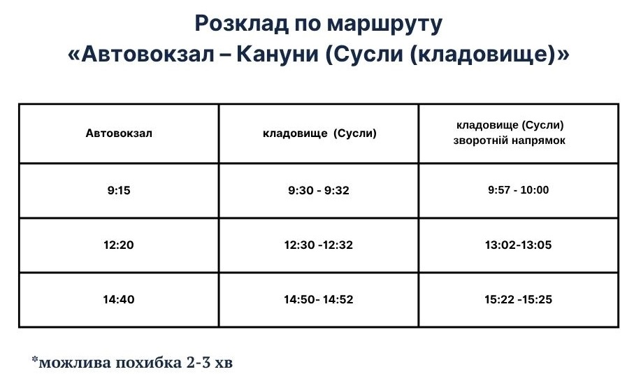 - зворотні рейси від кладовища о 09:57 - 10:00, 13:02 - 13:05, 15:22 - 15:25.